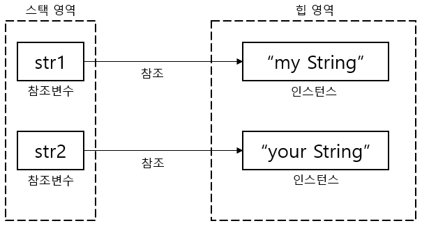 참조변수 str1에는 "my String"인스턴스의 주소값을 저장하는 형태로 참조하고있다.