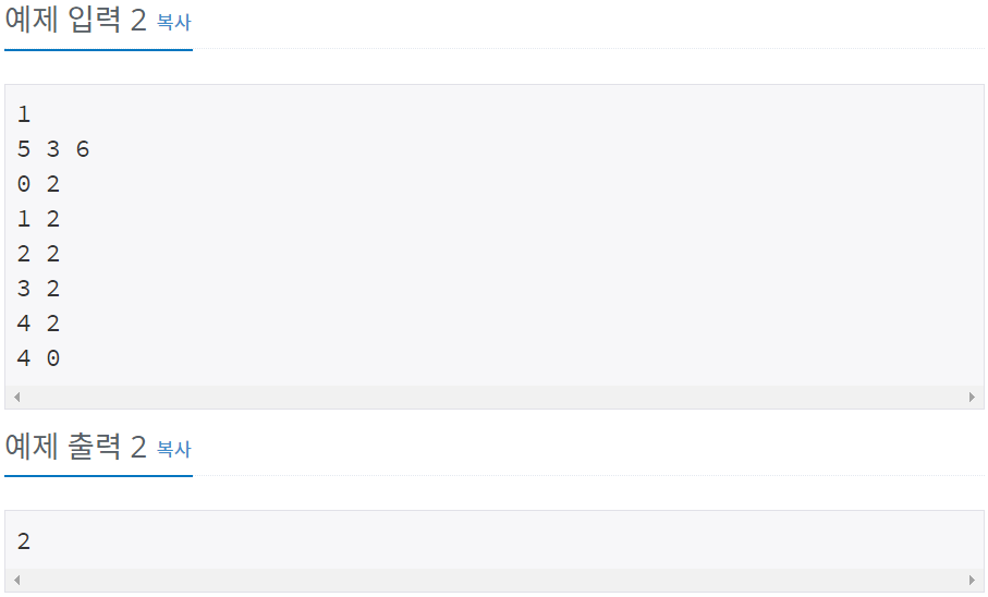 입력의 첫 줄에는 테스트 케이스의 개수 T가 주어진다. 그 다음 줄부터 각각의 테스트 케이스에 대해 첫째 줄에는 배추를 심은 배추밭의 가로길이 M(1 ≤ M ≤ 50)과 세로길이 N(1 ≤ N ≤ 50), 그리고 배추가 심어져 있는 위치의 개수 K(1 ≤ K ≤ 2500)이 주어진다. 그 다음 K줄에는 배추의 위치 X(0 ≤ X ≤ M-1), Y(0 ≤ Y ≤ N-1)가 주어진다. 두 배추의 위치가 같은 경우는 없다.