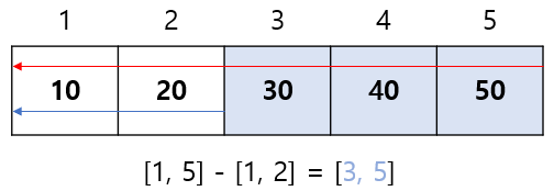 구간[3, 5]는 구간[1, 5]까지의 구간합과 구간[1, 2]까지의 구간합의 차와 같다.